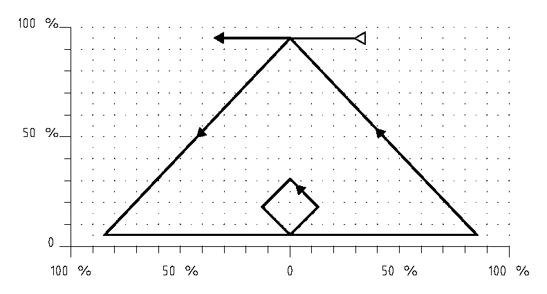 "In" is called at >30^95, flying horizontally to center window. At center window a 45 left sharp turn is made. Flying a straight line until approximately <15^5. A sharp 135 turn into a horizontal line with wingtip about 2% of the ground. In center window a diamond is flown with sides of 20% (so top of diamond is approximately at ^30) After turning at 0^2 the second halve of the horizontal line is flown. The triangel is finished by the "top"turn at the same spot of the first one. "Out" is called after about 30% horizontal flight at <30^95.