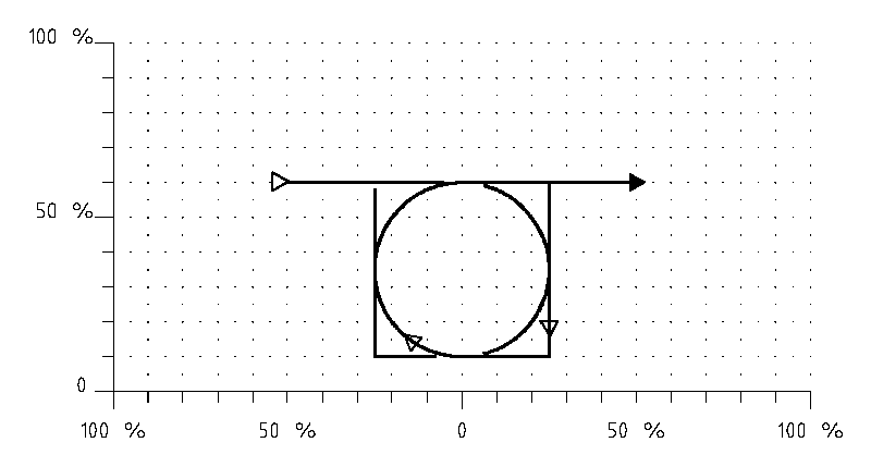 Donner le " in " à ^60 et avant que <50 soit atteint. Quand le CV atteint le centre de la fenêtre sur la première ligne droite le CV entame la courbe de la moitié droite du cercle. Dès qu'il se trouve de nouveau au centre de la fenêtre à ^10 la courbe s'arrête et le CV effectue le carré en entier pour se retrouver au même endroit en bas; après cela, le CV effectue la partie gauche du cercle pour atteindre le centre de la fenêtre à ^60. Donner le " out " après que le CV ait dépassé au moins 60%.