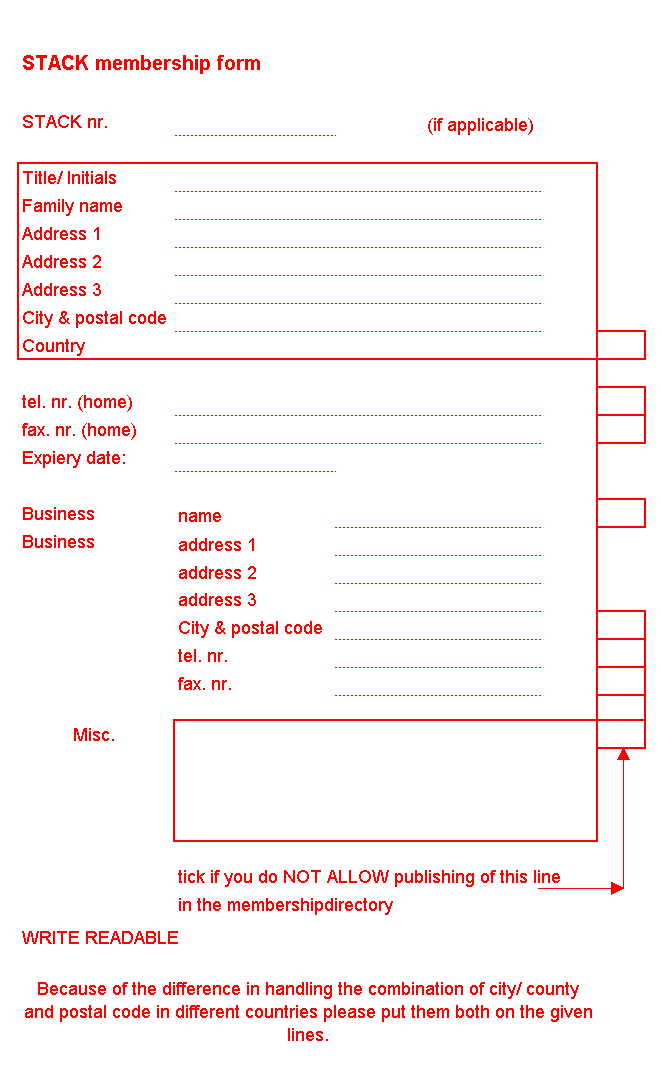 The top part of the form will be put on the mail you get from STACK, so make sure it is what you (and the post office !!) want. You can use three lines for the address, but always put "city/ postal code" and "country" on their proper lines.