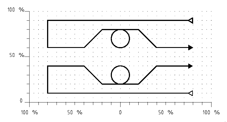 Donner le " in " quand les CV sont à >75^10 et >75^90. Quand ils atteignent <80, il font un virage de 90o l'un vers l'autre et un autre de 90o vers le centre de la fenêtre. Le deux virages sont secs, les horizontales sont à ^40 et ^60. Les cercles doivent se faire simultanément dans la partie centrale de la figure. Les boucles sont au centre de la fenêtre. Donner le " out " quand les CV atteignent de nouveau >75.