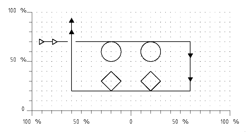 "In" is called when both kites are flying towards centre, at ^70, before reaching <70. Spacing is enlarged so top-loops (diameter 20%) are 40% apart. Left and right leg of rectangle at 60% of centre window. Corners of diamonds sharp. Distance between diamonds 40%, both flown in the same direction, simultaneously. "Out" is called when both kites fly upwards, after the second kite has reached ^75.