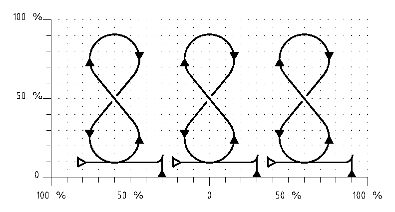 "In" is called when all kites are lined up at ^10. After 20% horizontal flight all kites simultaneously enters a 'eight' figure. The diameter of each arc is approximately 30% with the top of the eight at ^90. The point where the two straight lines intersect is at ^50 height. On returning to the same horizontal line at ^10 each kite travels 30% before executing a simultaneous 2-point landing. "Out" is called when all kites are landed.