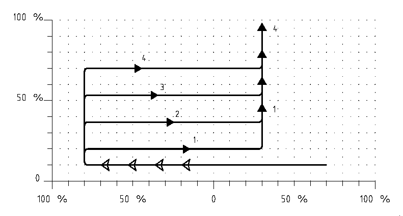 "IN" is called when all kites fly on the horizontal line at ^10, before first kite reaches <70. Distance between first and last kite 50%. Each kite in its turn makes a upward turn and then follows into a horizontal path. The first kite at ^20, the last kite at ^70, the other kites evenly spread in between. At the end of there horizontal flight all kites simultaneously perform an upward turn into a vertically lined up team formation."OUT" is called after at least 15% vertical flight.