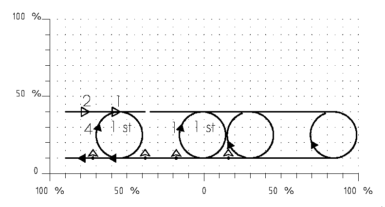 "In" is called when at least two kites are flying on a horizontal line at ^40, spaced about 20% apart. The first loop of the last kite is made with it's center at <65^25, with a diameter of approximately 30%. After the loops the kites continue on the same horizontal line, at the end of which a second loop (actually 1 1/2) is flown, the loop at the right (of kite 1) with it's center at >85^25. The kites return to the left on a line that 'touches' the bottom points of the loops. After about 65% horizontal flight the kites are turned in an upright position, but following the same horizontal line (so they flies sideways). This is done for at least 30%. "Out" is called when the last kite has reached <60^10, after the kites have turned into there "normal" position and flown another 15% horizontally.